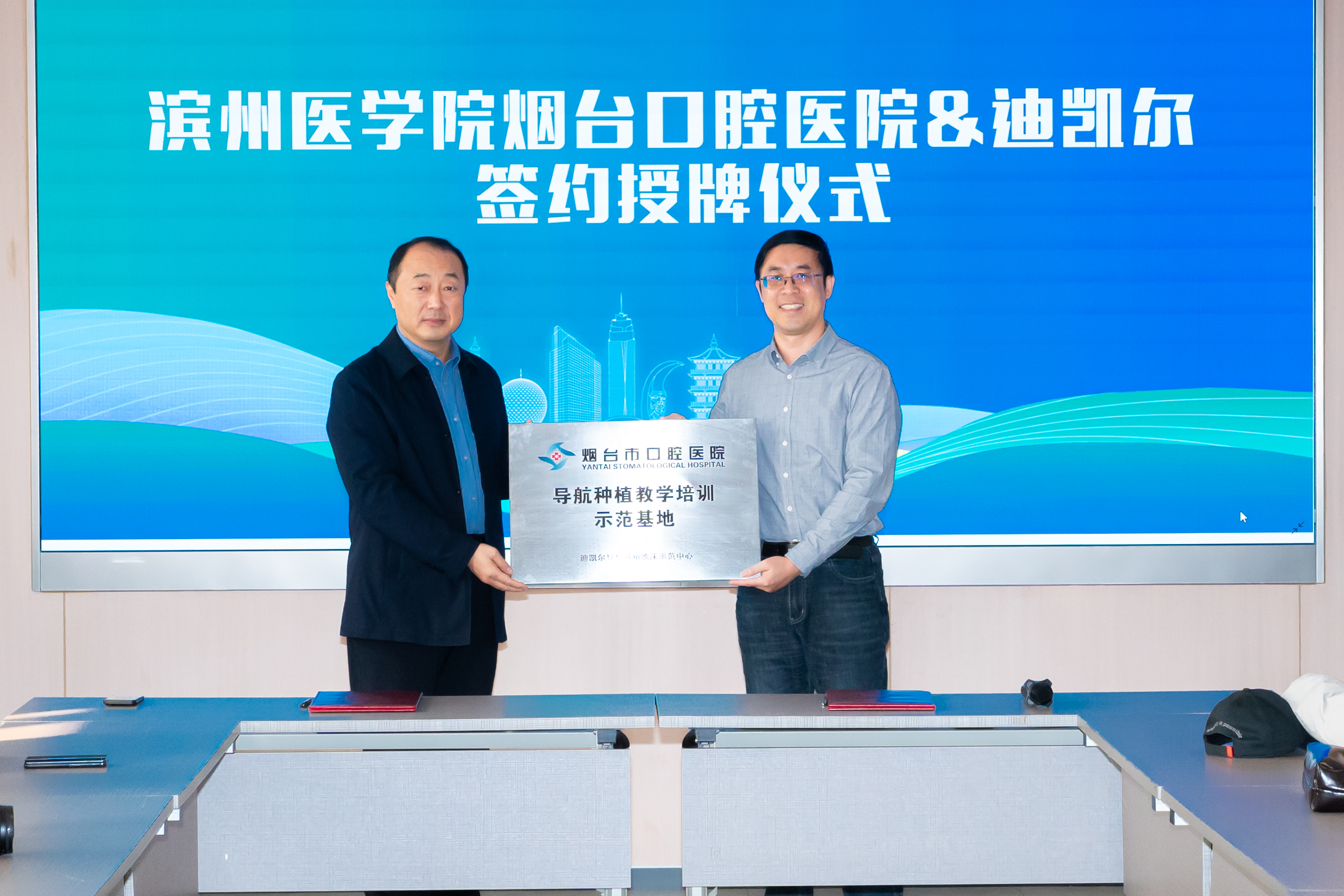 After the visit, Yantai Stomatological Hospital of Binzhou Medical College and Suzhou Digital-healthCare Co. Ltd. (hereinafter referred to as Dikaier) held a signing and awarding ceremony for the navigation implant teaching and training demonstration base. Professor Liu Zhonghao of the School of Stomatology of Binzhou Medical College and Mr. Chen Yun, General Manager of Dcarer, attended the ceremony.