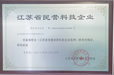 蘇州迪凱爾醫(yī)療科技有限公司(以下簡稱迪凱爾)在黨和政府的關(guān)心和支持下,經(jīng)過公司全體人員的艱辛創(chuàng)造和努力奮斗,在2021年2月被評為“江蘇省民營科技企業(yè)”。